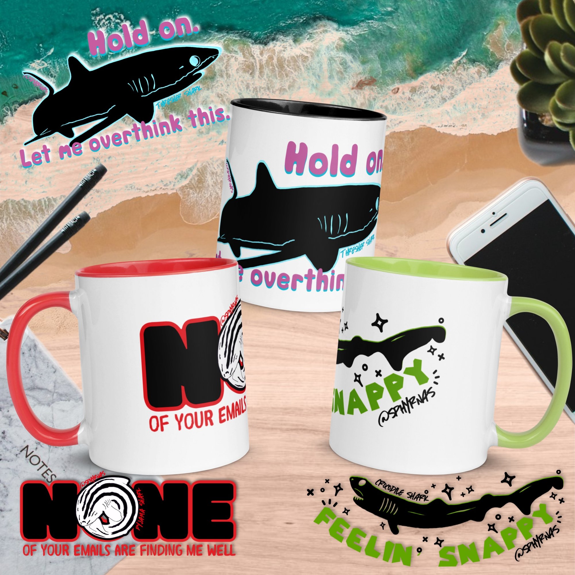 Mondays become Fridays when you catch one (or all three!) of these office vibe mugs featuring three cool shark species.